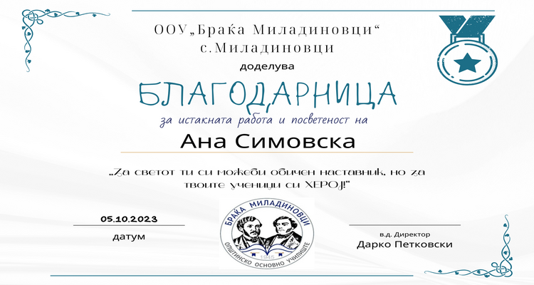 На 05.10.2023 директорот на училиштето со мало внимание ги потсети своите колеги колку е важна професијата наставник и зошто треба и понатаму да се работи со многу љубов и посветеност. Со доделување на благодарници им се заблагодари на своите колеги за нивната исклучителна работа и постигнувања.