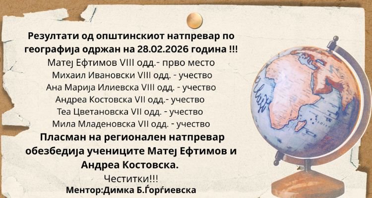 На 28.02.2026 се одржа општинскиот натпревар по географија.