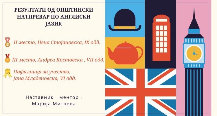 На 14.03.2026 година се одржа општински натпревар по англиски јазик во кој учество зедоа тројца ученици од нашето училиште. Им честитаме на успехот и им посакуваме уште поголем пласман на регионалниот натпревар!